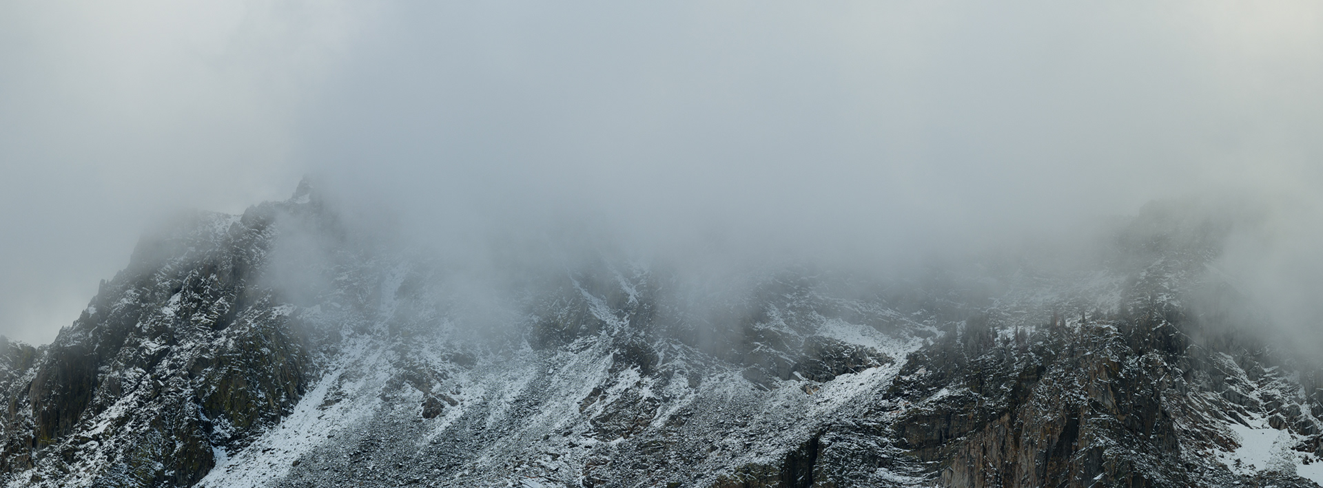 Snowy sleet obscures the pine view from our balcony